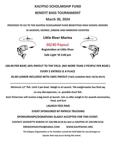 The Kalypso Benefit Bass Tournament was started in 2018 with some local fisherman. Since then, we have held one or two per year to aid in fundraising for our Kalypso Arts Scholarship Fund.